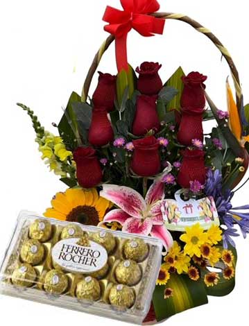 Canasta de rosas rojas con flores y follaje todo en base de canasta + caja acrilica de chocolate ferrero x 16 unidades